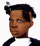 Er trägt eine gestreifte Skaterhose, ein weißes Sweatshirt mit Aufdruck, darüber eine lässige schwarze Steppweste.Seine Haare sind genau so wie es zur Zeit bei den schwarzen Jugendlichen getragen wird.